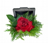Um lindo cooler de gelo, com itens happy hour, composto por uma cerveja artesanal e petiscos junto com um lindo arranjo de flores.